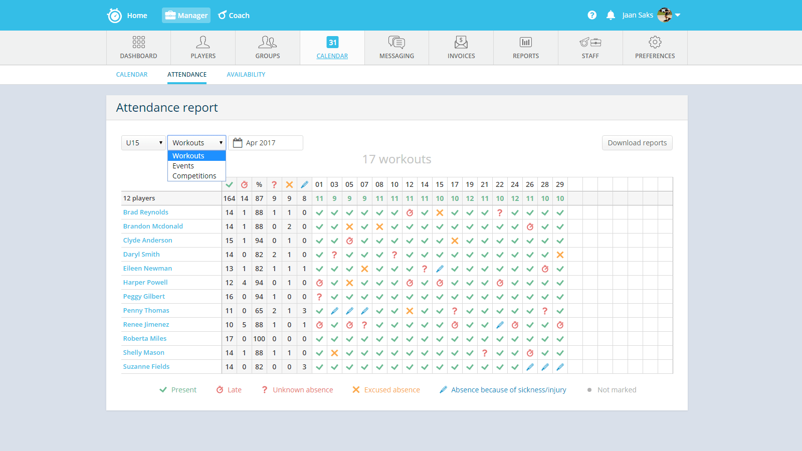 Attendance reports can be reviewed or downloaded later on the web. The Coach Diary App also shows attendance reports for all members in case a parent approaches a coach during the training and asks about that.