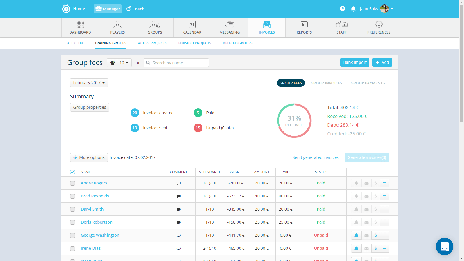 Creating invoices for the whole club and sending them out is a 5-minute task with Sportlyzer. Just set training fees for all groups, generate invoices and click “send”. Easy as that.